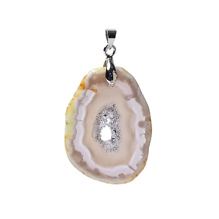 Το μενταγιόν από φέτα Αχάτη με λαμπερούς εσωτερικούς κρυστάλλους είναι ένα ξεχωριστό ενεργειακό κόσμημα που ενώνει τη σταθερότητα της γης με τη φωτεινή δύναμη των κρυστάλλων.