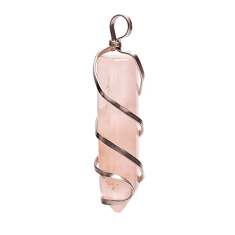 Ένα όμορφο μενταγιόν από φυσικό Ροζ Χαλαζία, σε σχήμα αιχμής και διακοσμημένο με μεταλλική σπείρα που αγκαλιάζει την πέτρα, δημιουργώντας ένα ξεχωριστό ενεργειακό κόσμημα με ήρεμη και τρυφερή ενέργεια.